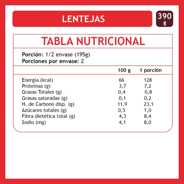 Ingredientes: Lentejas, agua, ácido ascórbico y EDTA disódico cálcico (antioxidante).