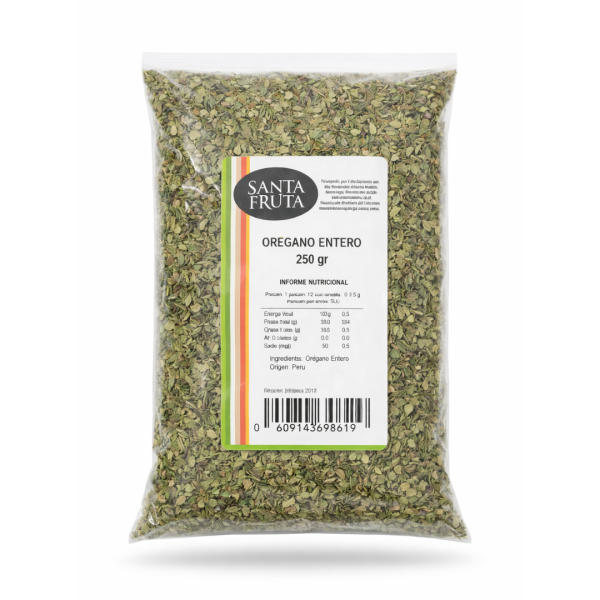El Orégano Entero Santa Fruta 250 gramos es un condimento esencial en la cocina, reconocido por su aroma intenso y su sabor característico que realza una gran variedad de preparaciones. Ideal para sazonar carnes, salsas, pizzas, pastas, guisos, ensaladas y recetas tradicionales.