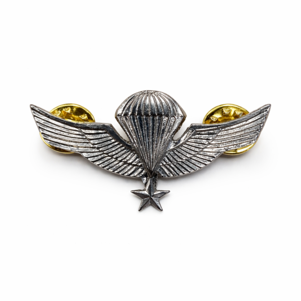 Su diseño en color plateado incorpora un paracaídas con alas extendidas, acompañado de una estrella inferior, simbolizando el mando, la precisión y la excelencia técnica requerida para liderar operaciones de salto.
